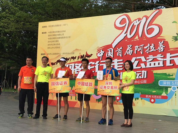 “骆驼行走-公益长征”的公益活动得到了中国证券基金业协会、国信证券、中国证券登记结算总公司、深圳证券交易所、深圳市证券协会、深圳上市公司协会和深圳团市委的大力支持和发动。