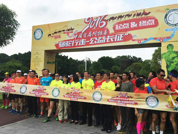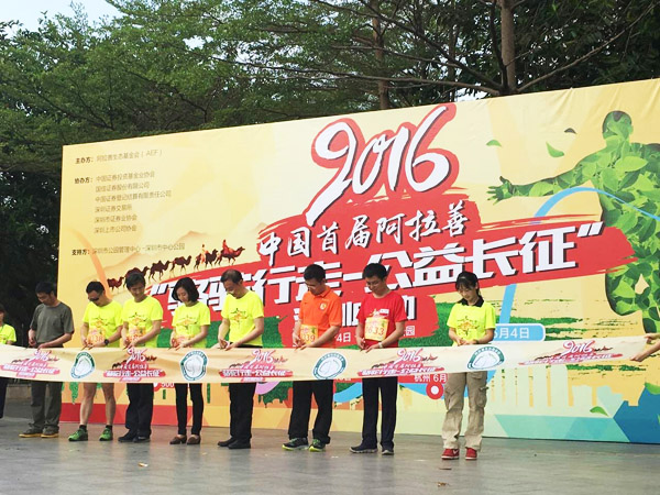 2016年5月4日,阿拉善生态基金会在深圳市福田区深圳中心公园,启动了2016中国首届阿拉善“骆驼行走—公益长征”活动仪式。今年是红军长征胜利80周年,在“五四”青年节隆重举行首届“骆驼行走-公益长征”活动启动仪式,既是对长征精神的纪念,也是对荒漠治理的宣传,更是对建设美丽中国号召的响应。